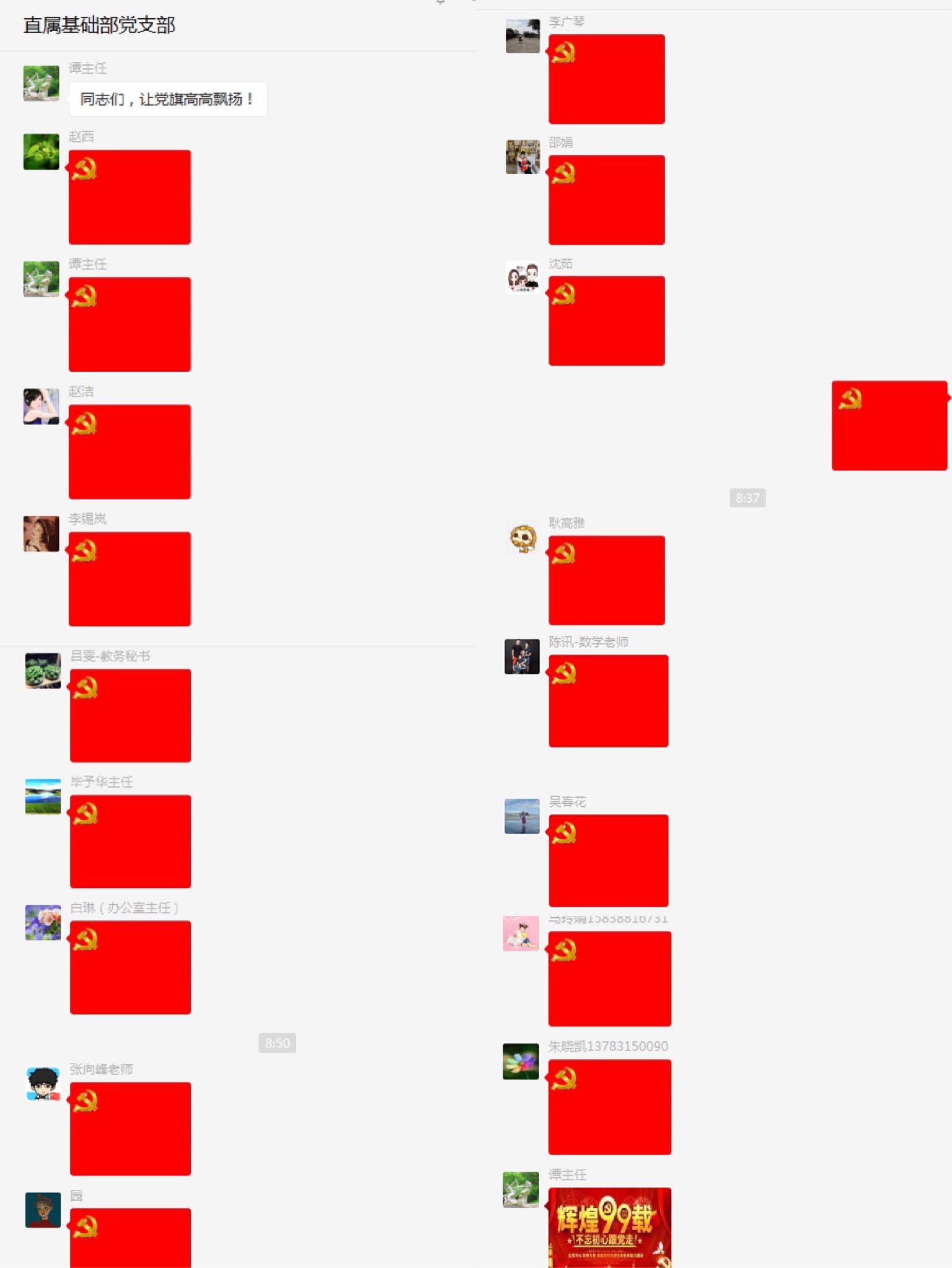 7月1日上午,为纪念中国共产党成立99周年,直属公共基础教学部支部创新活动方式,在支部微信活动群举办“党在我心中 让党旗高高飘扬”党旗接龙活动。该支部29名党员踊跃在微信群内接龙党旗,庆祝党的生日,表达对党的热爱和美好祝福。