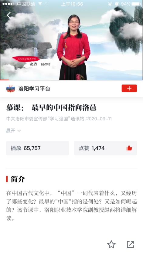 近日,由公共基础教学部语文教研室副教授赵西精心录制、党委宣传部多次编辑推送的慕课《最早的中国指向洛邑》被收入“学习强国”学习平台,以供全国9千万多党员和广大社会群众学习。