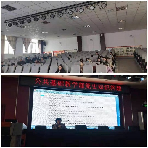 为深入开展党史学习教育活动,引导广大党员干部和群众做到学史明理、学史增信、学史崇德、学史力行,4月8日下午2:00,直属公共基础教学部支部全体教师在瀍河校区五楼会议室参加“学史爱党 学史爱国”党史知识100题竞答主题党日活动。
