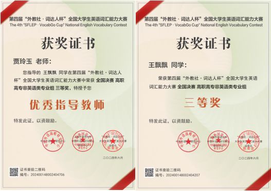 近日,由中国外语战略研究中心、中国外语教材与教法研究中心和上海外语教育出版社联合主办的2024年第四届“外教社·词达人杯”全国大学生英语词汇能力大赛落下帷幕。在公共基础教学部精心组织、广泛宣传动员和各二级学院的大力支持下,我校共有308名学生报名校赛,经过校内比赛选拔和英语教师们的精心辅导,护理(涉外)专业王飘飘获得高职高专非英语专业组国赛三等奖;护理专业常怡婷获得省赛一等奖;康复治疗专业谢明星获得省赛三等奖。