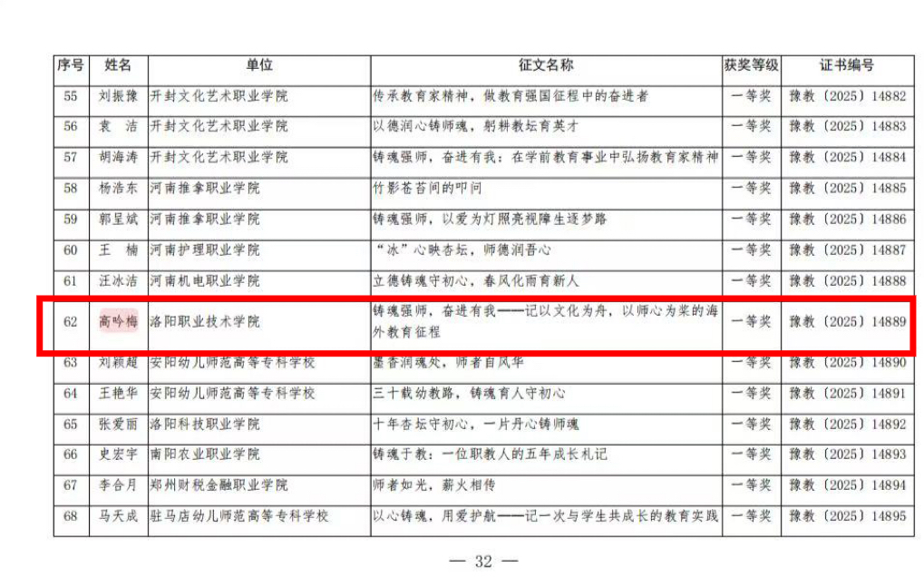 近日,河南省教育厅公布2025年“铸魂强师,奋进有我”师德主题教育征文比赛评选结果,洛阳职业技术学院获得一等奖1项,二等奖2项,公共基础教学部教师高吟梅参赛作品《铸魂强师,奋进有我——记以文化为舟,以师心为桨的海外教育征程》获得一等奖。