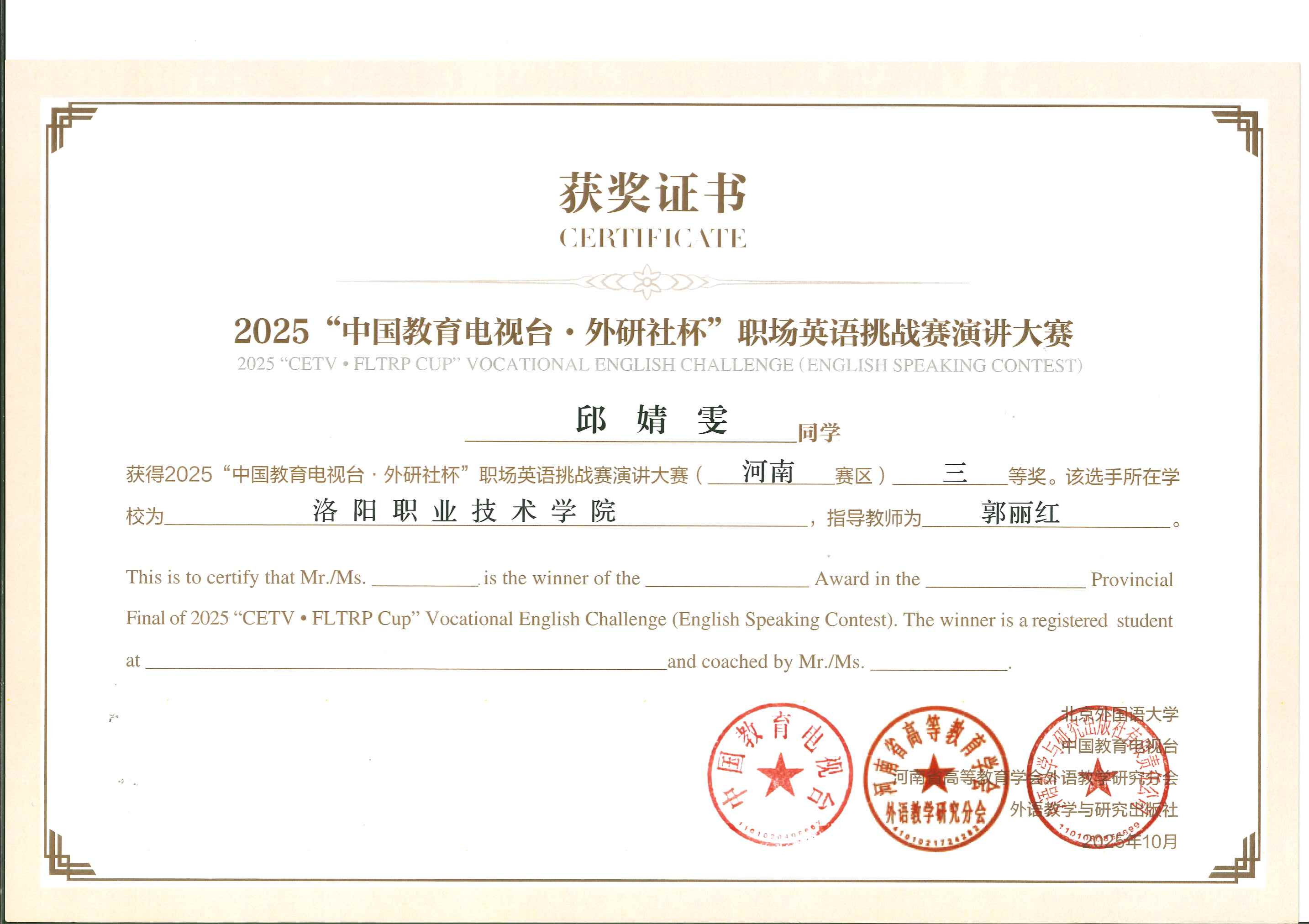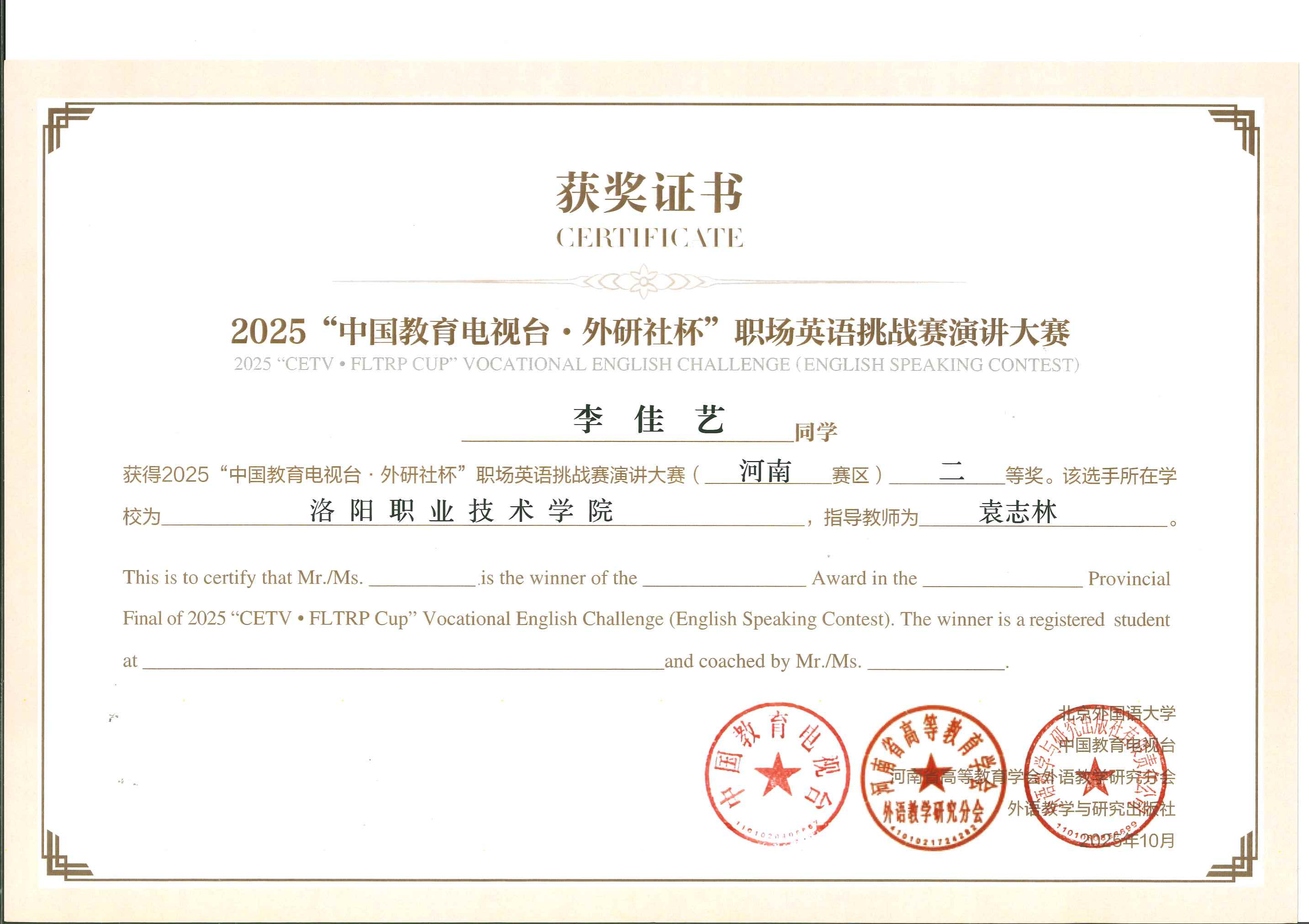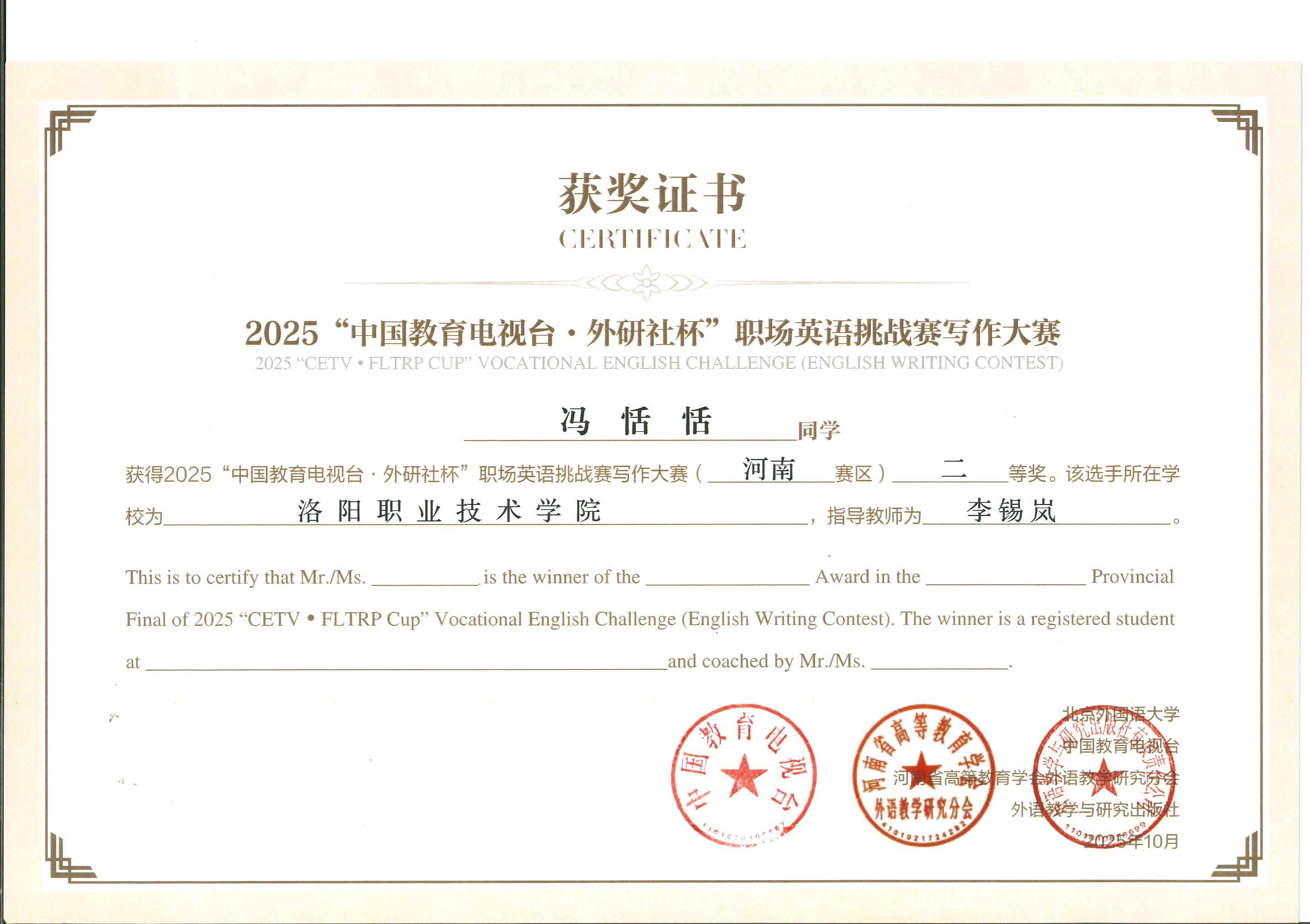 近日,由北京外国语大学主办、中国教育电视台与外语教学与研究出版社联合承办的2025“中国教育电视台・外研社杯”职场英语挑战赛河南赛区比赛在河南工业职业技术学院圆满落幕。我校学子凭借扎实的英语功底、出色的职场应用能力和从容的竞技风采,在全省45所院校206名参赛选手的激烈角逐中脱颖而出,斩获写作比赛省级二等奖3项,演讲比赛省级二等奖1项、三等奖1项,充分展现了我校职业英语教学的丰硕成果和学子们的国际化素养。