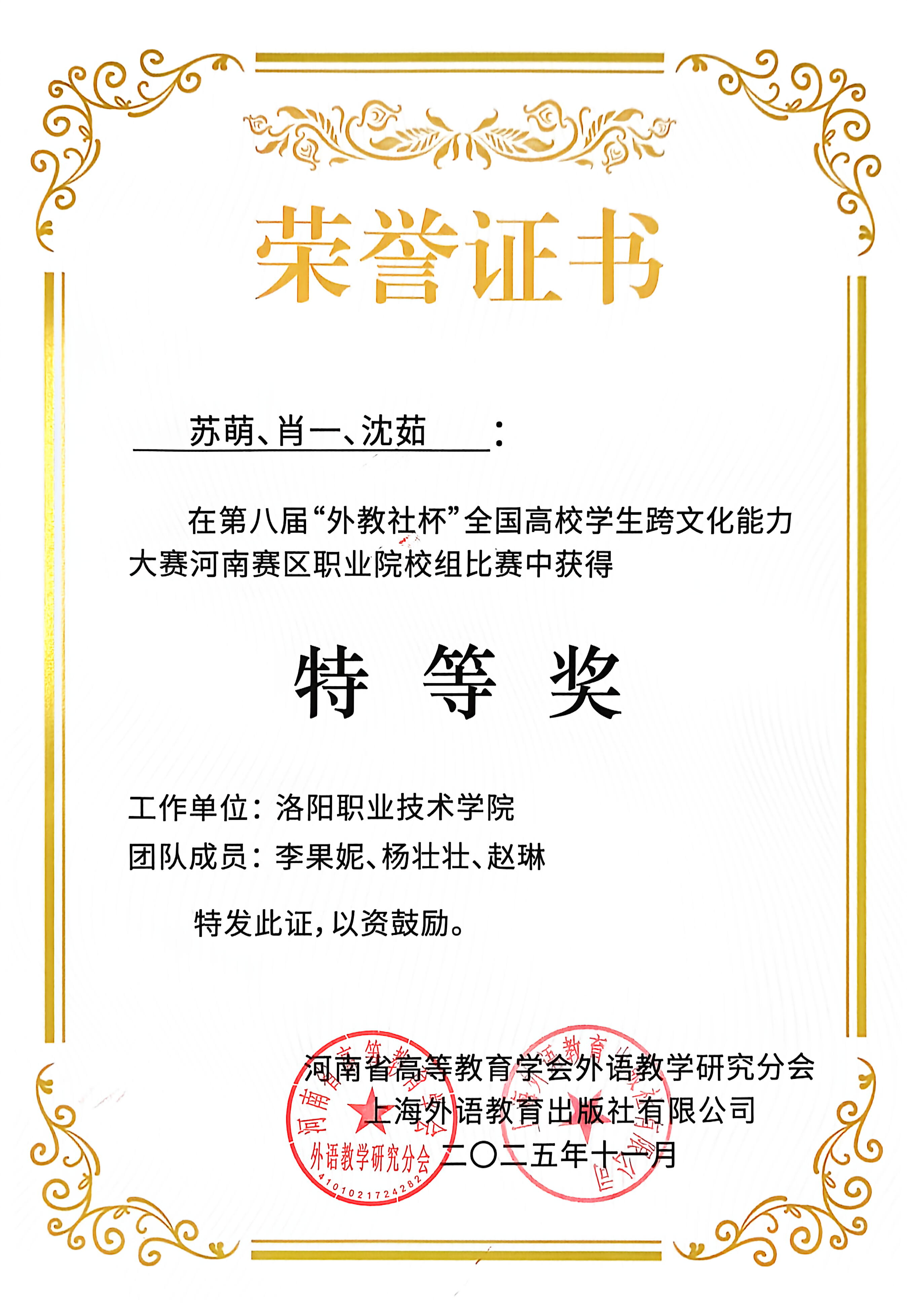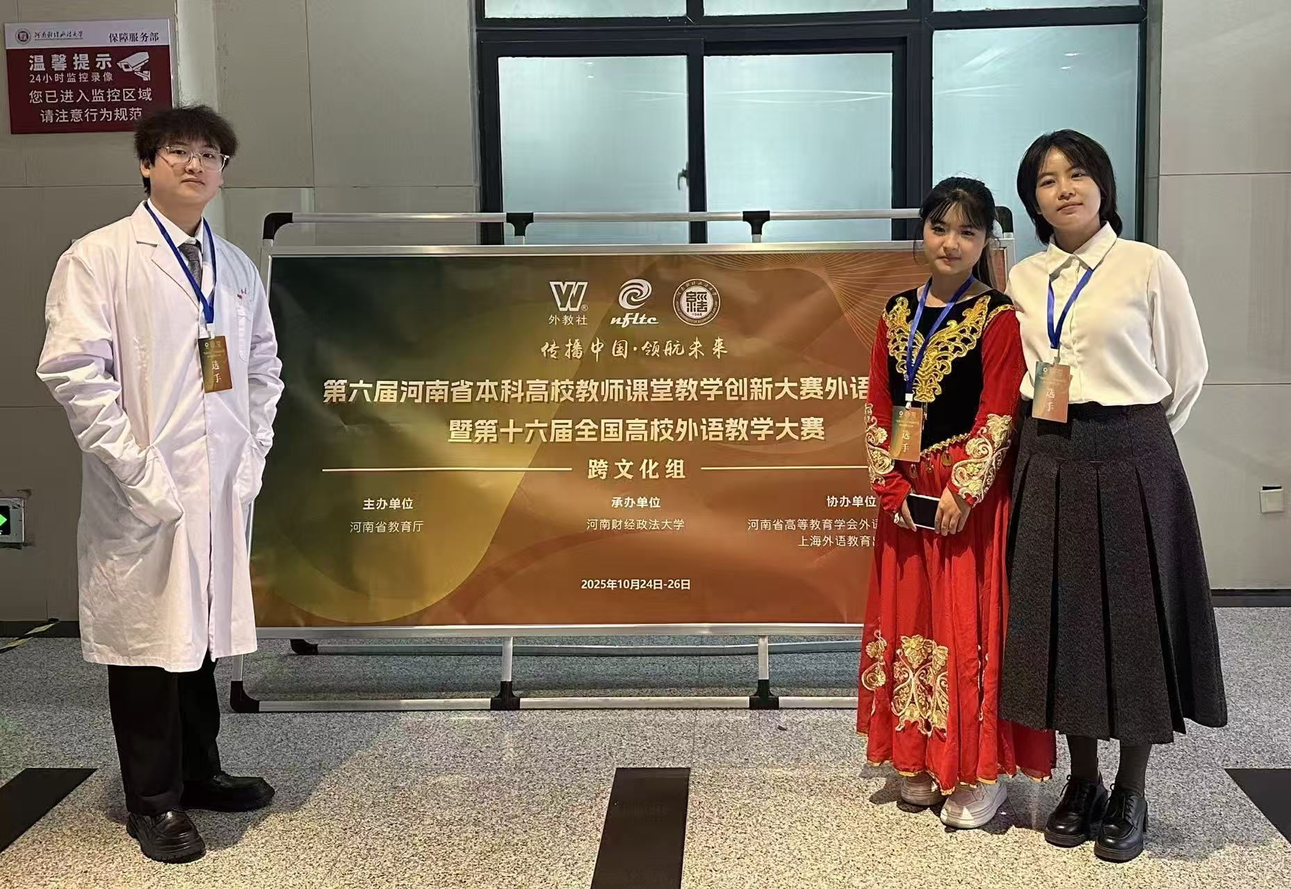 近日,由河南省高等教育学会外语教学研究分会主办、上海外语教育出版社承办的第八届“外教社杯”全国高校学生跨文化能力大赛职业院校组河南赛区比赛在河南财经政法大学落幕。我校学子李果妮、杨壮壮、赵琳组成的参赛团队,凭借深厚的跨文化素养、扎实的理论应用能力和出色的现场表现,在全省多所职业院校参赛队伍的激烈角逐中脱颖而出,成功斩获省级特等奖,指导教师苏萌、肖一、沈茹获优秀指导教师荣誉,充分彰显了我校在跨文化人才培养领域的显著成效和学子们的国际化综合素养。